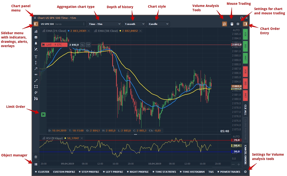 Learn how to launch and configure the chart panel. What types of charts are available in the platform? How to activate volumetric analysis tools? Get to know about overlays, indicators and drawings.