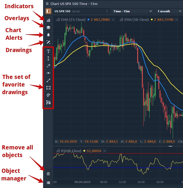 The top toolbar allows you to select a trading instrument, set the chart type and style, timeframe, depth of market data as well as call additional toolbars. Here is the list of chart types and styles where you can find a detailed explanation of how to build them.