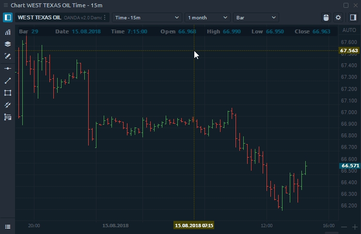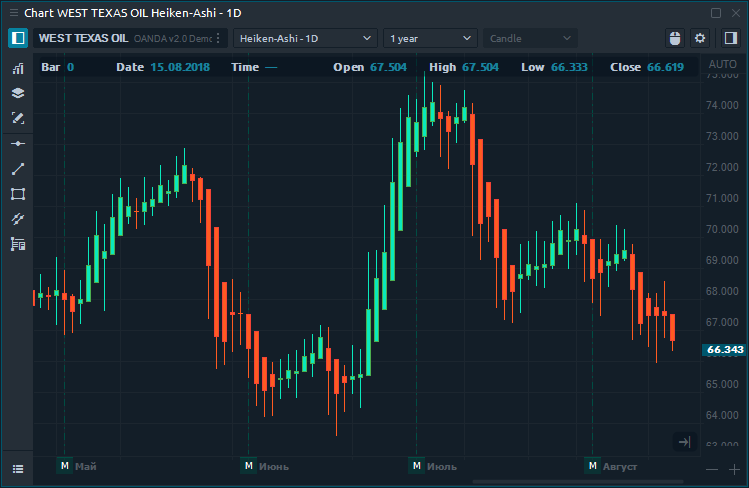 Heiken-Ashi chart (HA) is a modified type of classic candlestick chart, which is based on recalculation of OHLC data. The resulting candlestick filters out some noise in an effort to better capture the trend and reversal points.