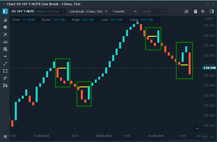 It is important to note that the bars on this chart are usually called "lines". Line Break based on closing prices so it takes the current price and compares it with the closing prices of the previous bars (lines). The number of the previous bars that participate in the calculation specified in the chart settings.