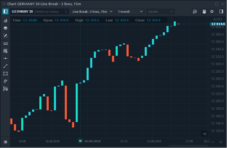 Line Break is quite similar to other time-independent charts like Kagi, P & F, Range Bars. Line break chart prints the series of bars which represent increasing and falling prices. The key parameter that participates in the chart plotting is the number of the last bars for building the current bar.
