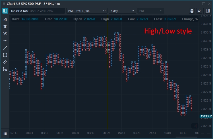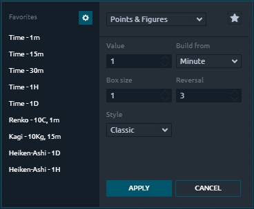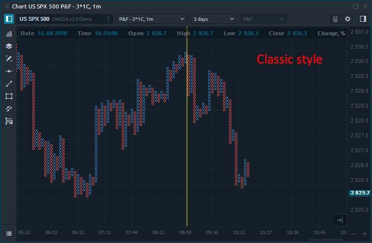 Points & Figures is one of the most popular chart types that allows traders to analyze only the price without time-bound, thereby eliminating market noise. In contrast to the usual candlestick charts, P & F consists of X and O columns, which reflect the rise or fall in prices, respectively.