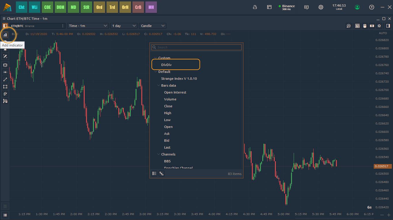 Open DivDiv indicator from the indicators list on the upper left side of the chart panel.