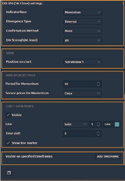The majority of traders will only need to open the first section of the indicator settings to adjust Divergence. That is why you will find a guide to the first section in this manual.