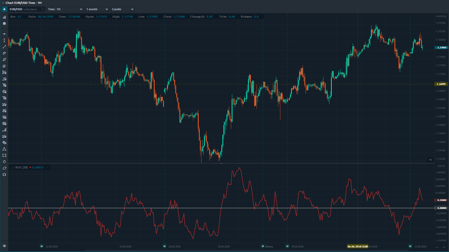 Rate of change is the same indicator as Momentum and also shows an acceleration of price movement. But instead of Momentum, Rate of Change is expressed in percantage value. Simply put ROC measures the percentage change in price between the current price and the price N-periods in the past.