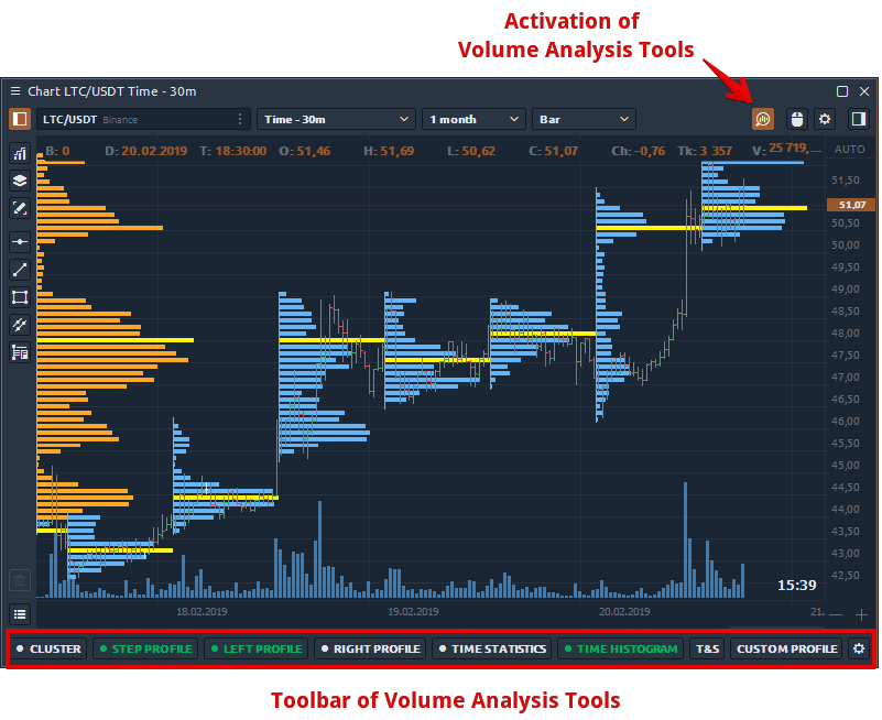 3rd Dimension trading platform provides Volume analysis tools, an advanced analytical functionality, which allows you to see the traded volume at each price level, assess the balance between buyers and sellers and understand the intentions of traders regarding the future price.