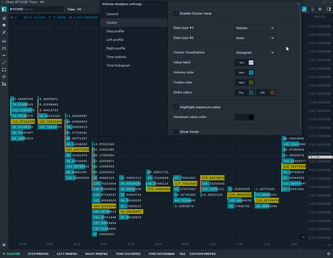 Cluster chart has various settings allowing to display volume data from different sides. For example, you can choose different types of data for each bar, as well as configure colors, which will simplify the perception and analysis of volumes, trades, etc.