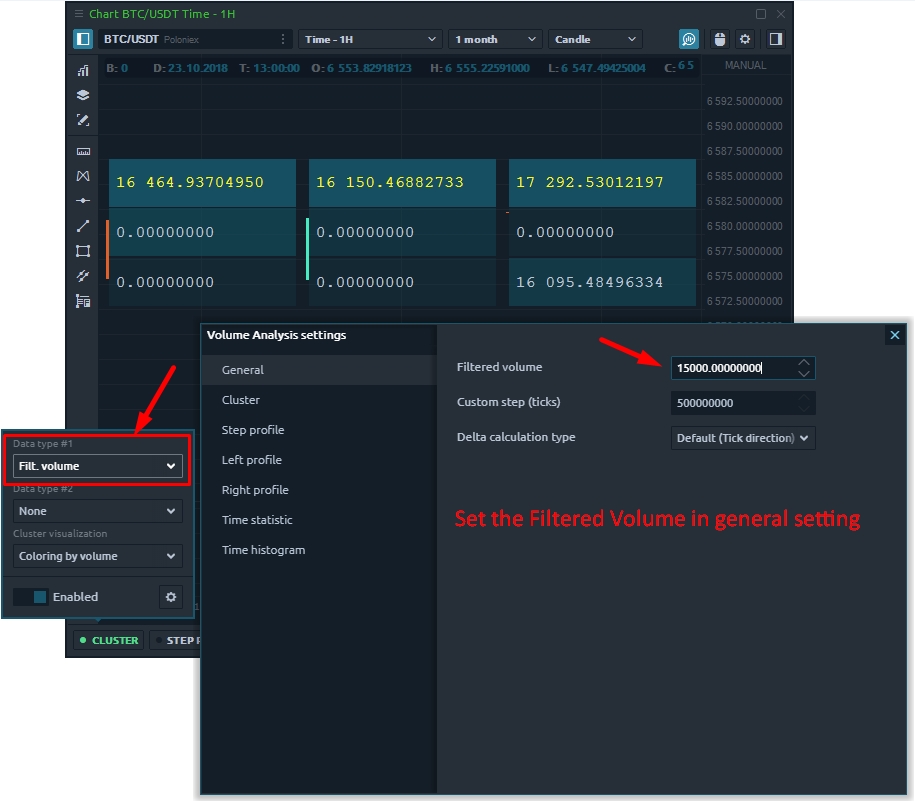 Select Filtered Volume as the data type in clusters to display them on the chart. All values that are less than the filtered volume are presented as zeros.