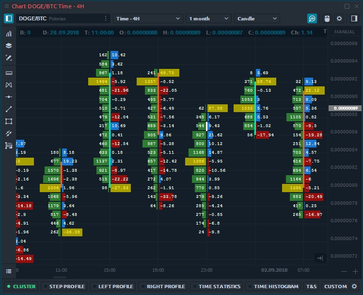 Cluster chart, known as Footprint chart in other trading platforms, is an advanced chart type that shows a comprehensive view of the candle chart. It allows to look inside the price and see all market actions. Cluster chart combines several important characteristics like time, OHLC prices, trading volume, number of buy and sell trades.