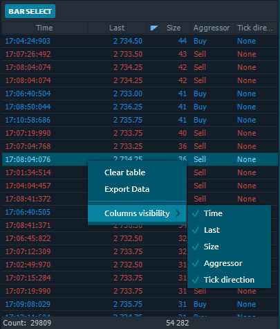 By default, the table displays five columns β Time, Last price, Trade Size, Aggressor flag, Tick direction. You can move any column of the table left or right, as well as sort or filter data.