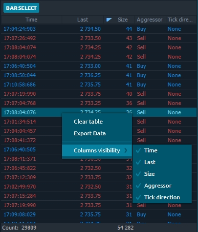 By default, the table displays five columns — Time, Last price, Trade Size, Aggressor flag, Tick direction. You can move any column of the table left or right, as well as sort or filter data.