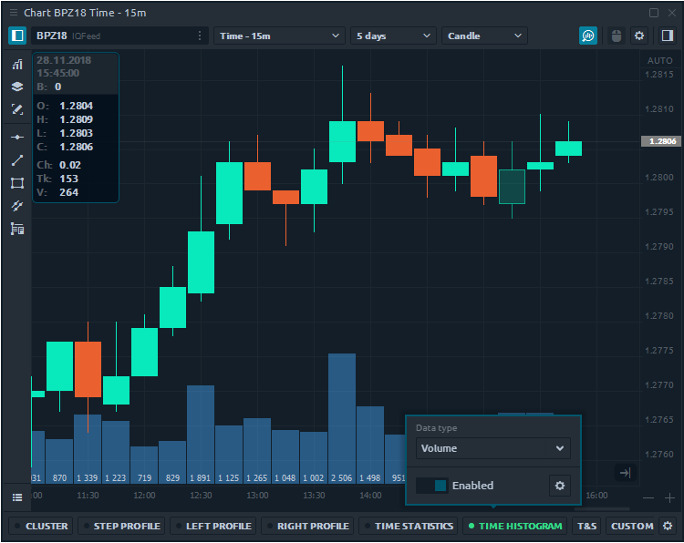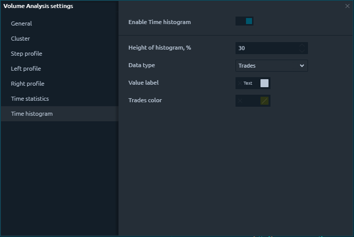 Click on the Time Histogram and switch the button "Enable" to activate the functionality on the chart. Time Histogram supports an extensive list of Data types that you can change either in the settings or directly in the activation mode.