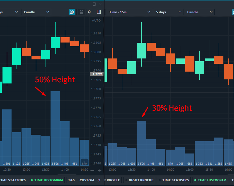 Height of Histogram, % β determines what part of the chart area will be occupied for displaying volume data. If you set the value to 50%, then half of the chart area will be filled by Time Histogram data.
