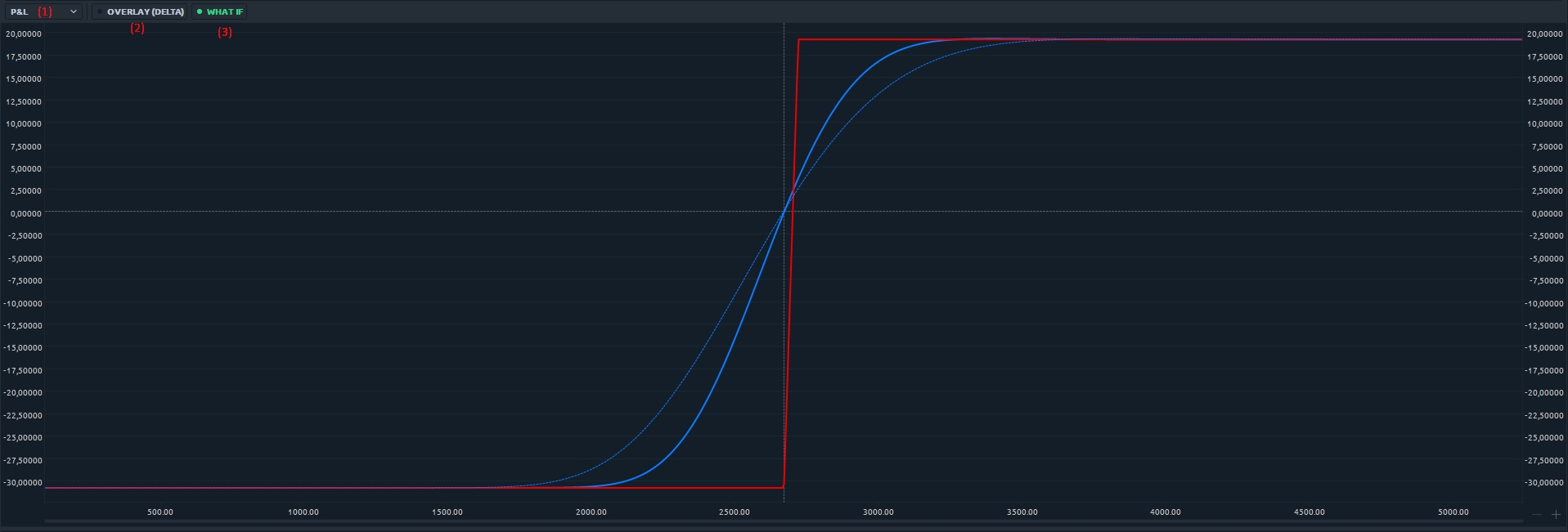 (1) - This controll allows to select a chart's data type. Possible options are: P/L, Delta, Gamma, Theta, Vega, Rho (2) - This controll allows to add an overlay to main chart