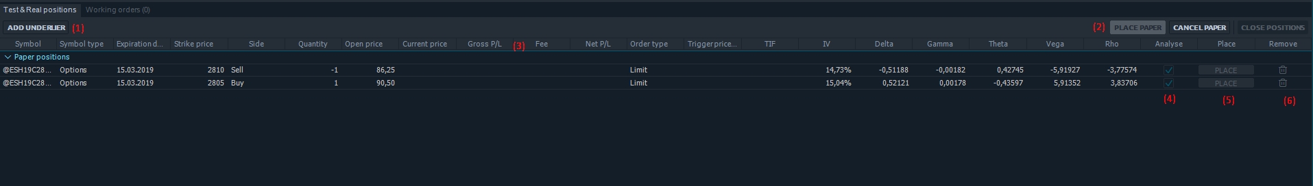 (1) - Add underlier button allows to add a paper position of underlying symbol to the list of existing positions. (2) - Hot buttons provide a possibility to make group actions with portfolio such as: place papers, cancel papers or close real existing positions. (3) - Right click on table's header will show a context menu where trader can select visible columns. (4) - By clicking on Anayse checkboxes user can include or exclude certain positions from portfolio. (5) - Place button allows to place a paper position (6) - Remove icon allows to remove a paper position