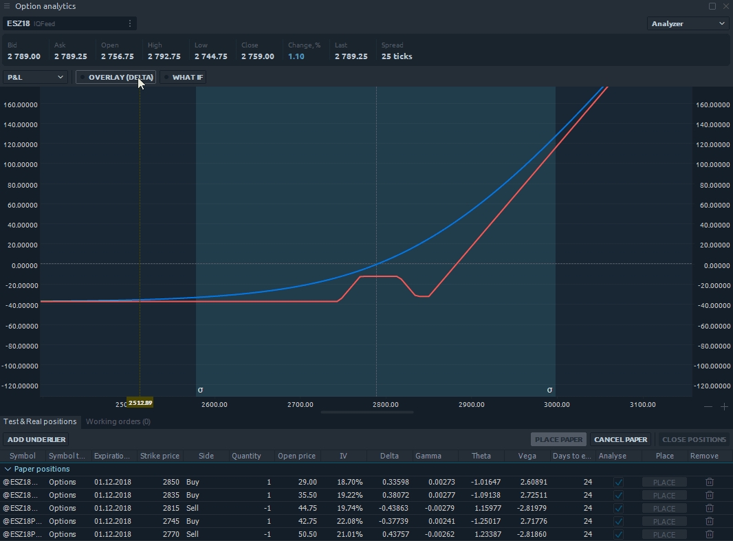 Add Paper positions in the options desk and the strategy analyzer will immediately show the option profile. This mode will allow you to see all changes in options desk — prices, volatility, options Greek values — and option profiles on one screen.
