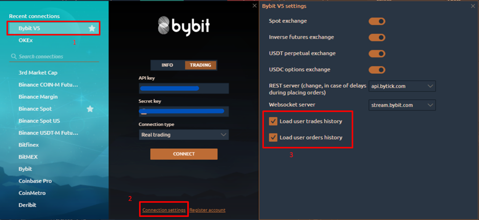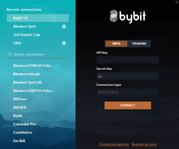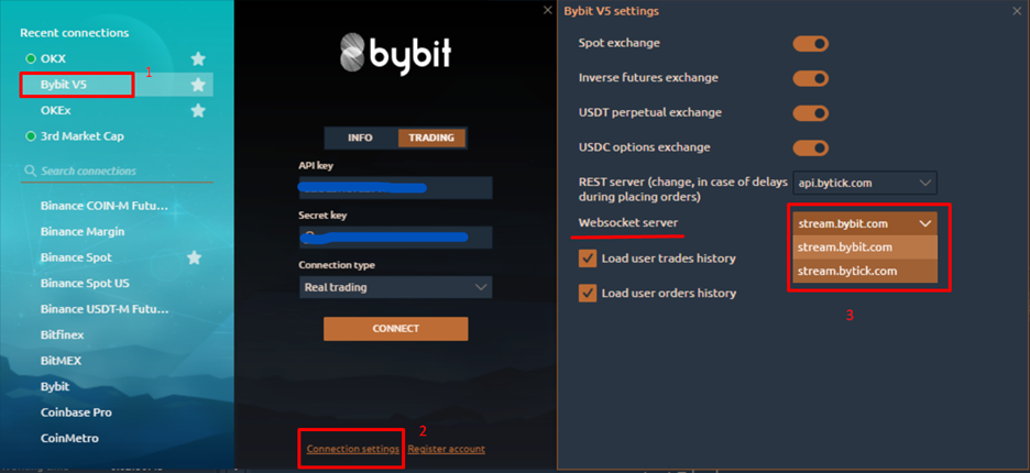 * &#x20;If your Bybit connection is unstable(It keeps disconnecting and reconnecting), try changing the WebSocket server from the connection settings, this may help to reduce the issue :
