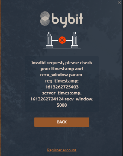 ·        **"Timestamp error"** means that your local time on PC is not the same as on Bybit servers and it should be synchronized.