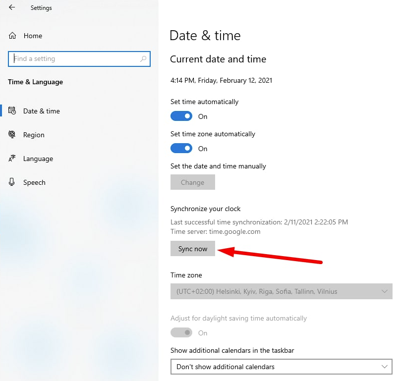 **·**        To solve it, please, go to **Windows Settings > Time & Language >** and click on **Sync Now** butto&#x6E;**.**