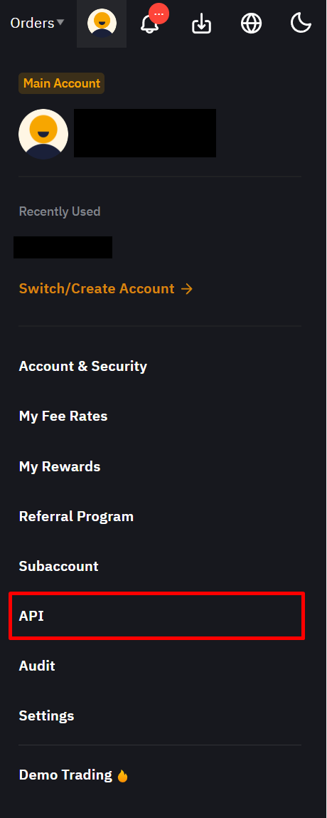 To create/manage your Bybit API keys, please click onto the top right on your username. Inside the dropdown menu, click on 'API'.
