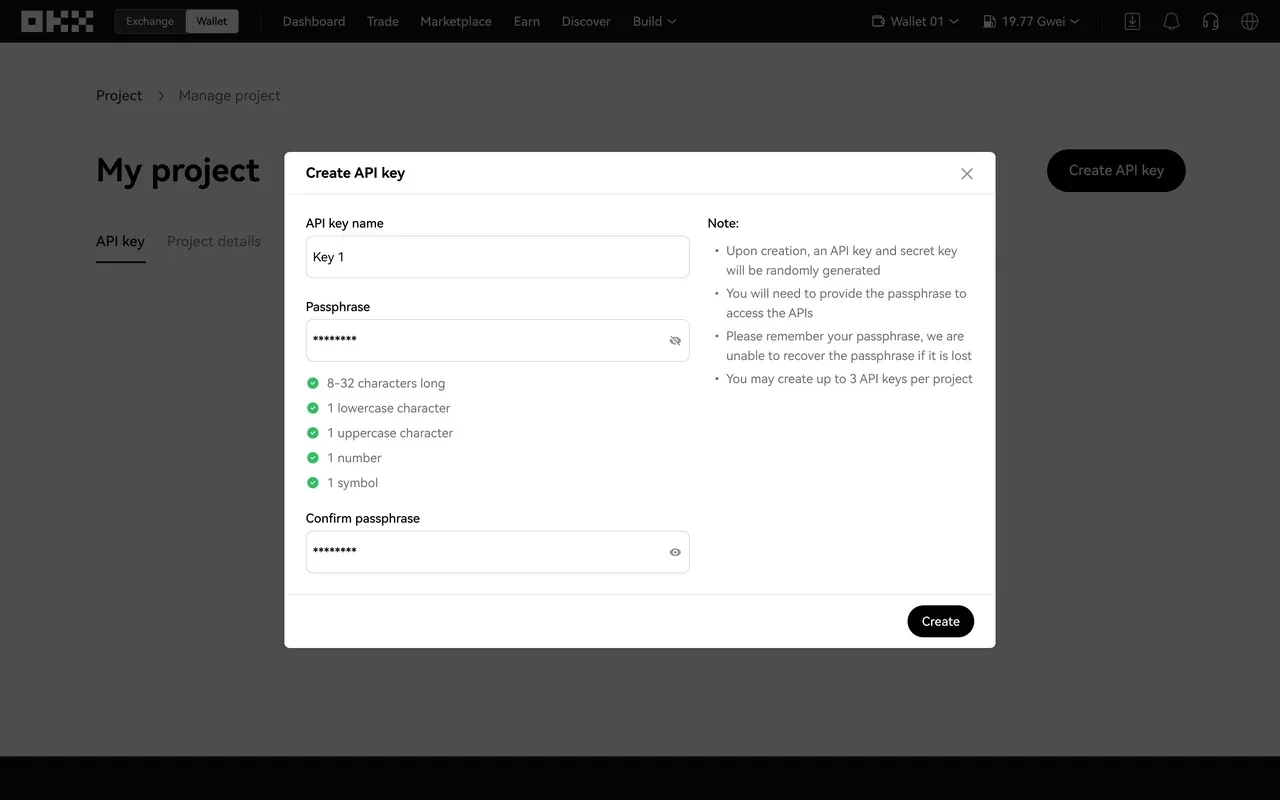 Enter your API key name and passphrase for your new API key. Click Create to generate your API key.