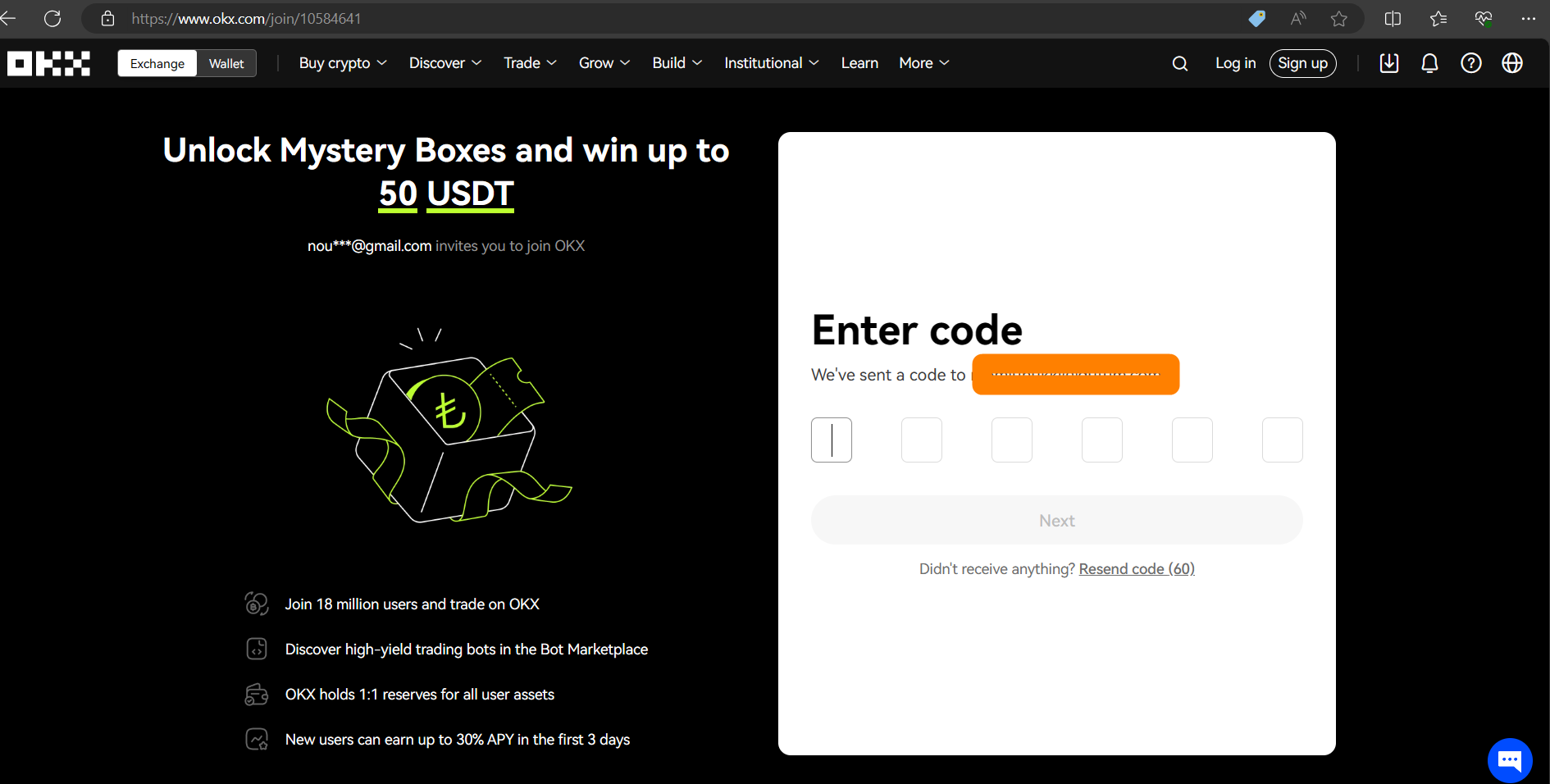 Check your email for the six-digit registration verification code that OKX sent you and enter it in the Enter code field within 10 .