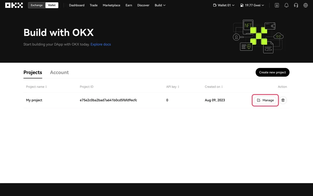 Click Manage on the right of the project you wish to create an API key from.
