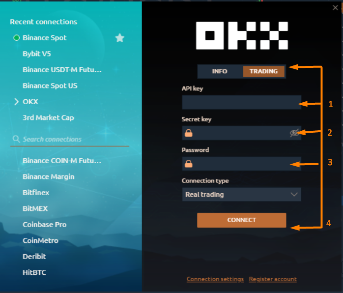 Trading Mode — for trading on the OKX exchange in demo or real mode. API Keys are required. Below you will show how to get keys for trading.