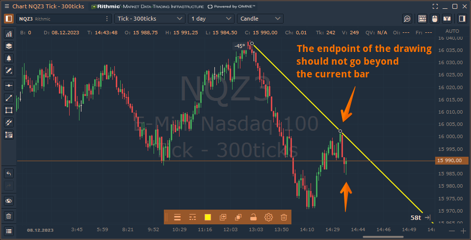 Currently, there is an issue with the independent movement of drawings (trendlines, rectangles, etc.) on non-time-based chart types such as Tick, Range bars, Volume bars, and Renko.