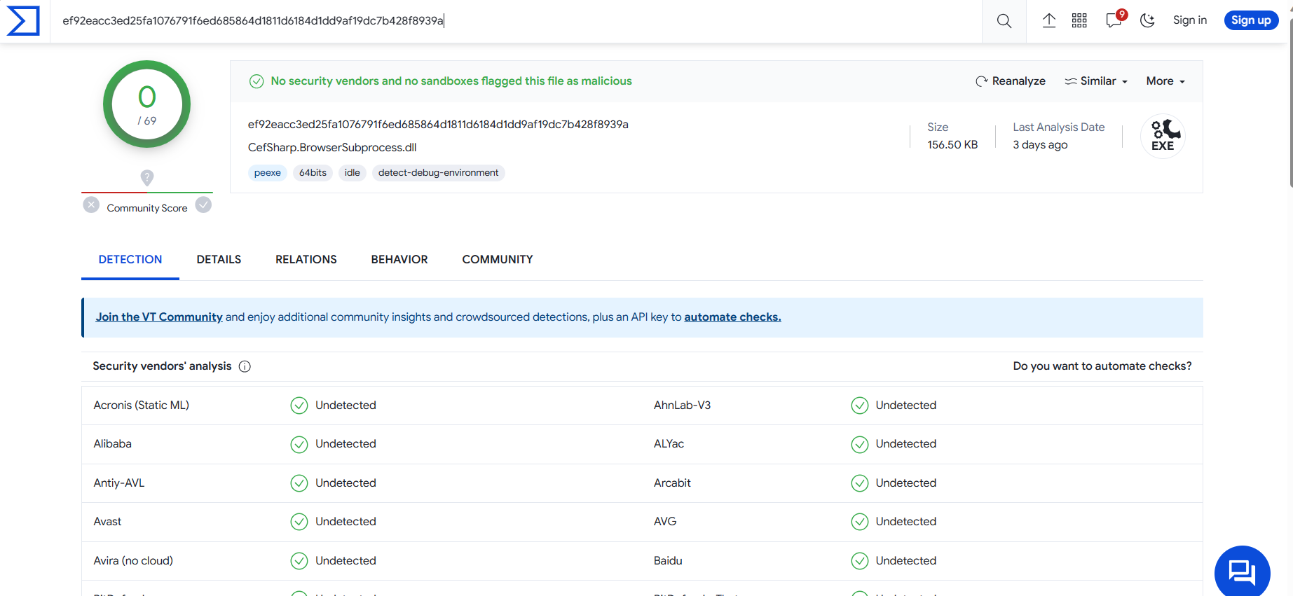 We don't know a reason why antivirus sometimes recognizes this file as suspicious, but if you search in Google, you can see that there are already many reports from users about the same problem: https://www.google.com/search?q=cefsharp.browsersubprocess.exe+antivirus In general case antivirus developers recommend reporting a problem as false positive.