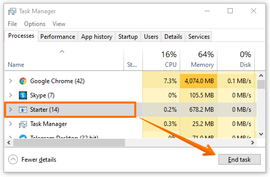 If even after a few minutes the platform fails to start, go to the Task Manager. Press Ctrl+Shift+Esc to open the Task Manager with a keyboard shortcut or right-click the Windows taskbar and select βTask Manager.β Find the process with the name "Starter", select it and click on End task.
