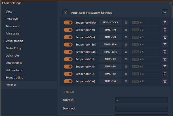 <figure><img src="https://content.gitbook.com/content/urdqk4sHwHHpr4J3s5P6/blobs/Po9mqcDYfrQHUnIxNB9a/hotkeys.png" alt=""><figcaption><p>Custom hotkeys in Chart panel settings</p></figcaption></figure>