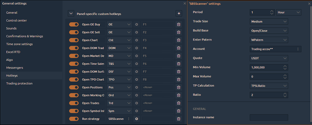 You can create a hotkey to start any available pre-configured strategy using the hotkey. Once you add this action in General settings hotkeys, you must patiently configure the strategy parameters first because it will be launched in the background when the corresponding hotkey triggers.