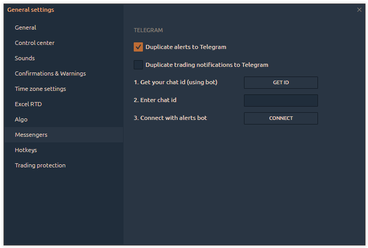 To add a bot to the Telegram, open the platform's General Settings -> Messengers -> Duplicate alerts to Telegram.