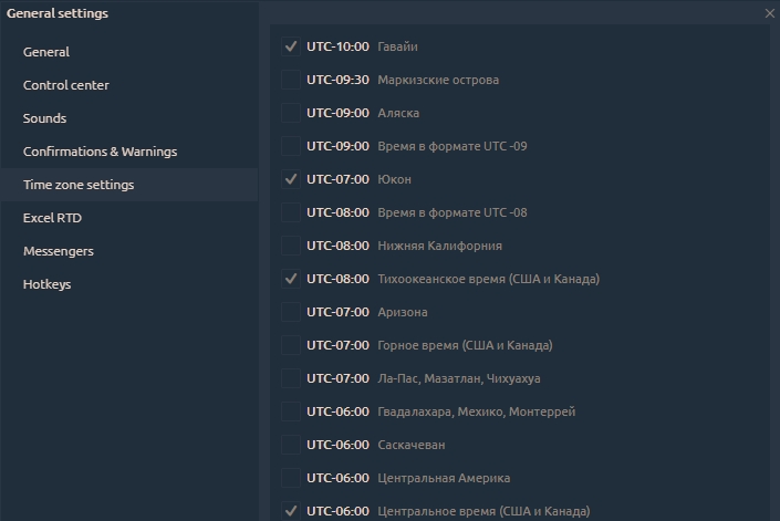 In case you are trading in various markets that are in different time zones, you will find it useful to switch the time indicator in Control center to one of your favorite market times.