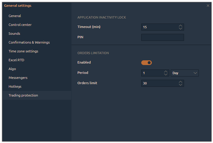 Orders Limitation. When enabled, this feature restricts the platform from placing more orders (limit and stop orders) than a specified number within a set time period. This setting can affect copy trading, especially when using multiple accounts.