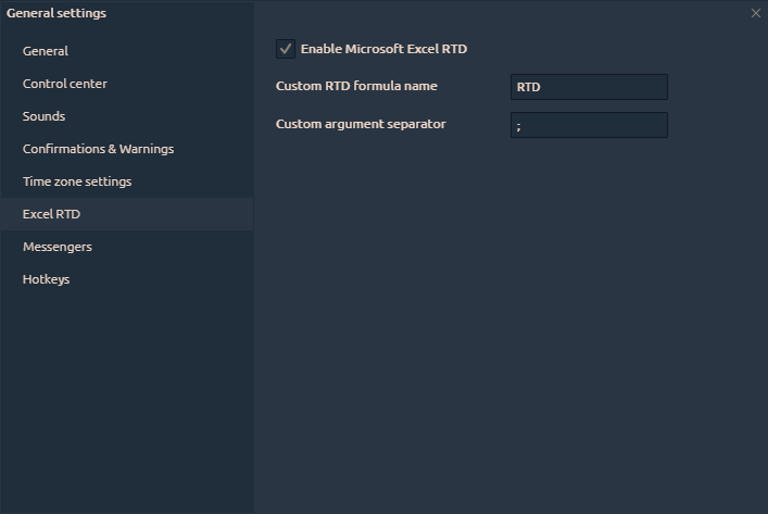 Start from version 1.35 3rd Dimension supports Real Time Data (RTD) for sending data and other market information to Microsoft Excel®. Read our guide about how to enable and use RTD function with 3rd Dimension.