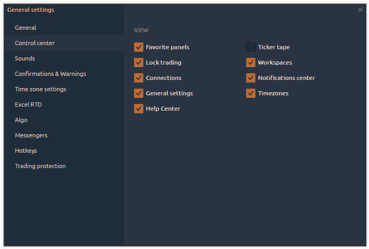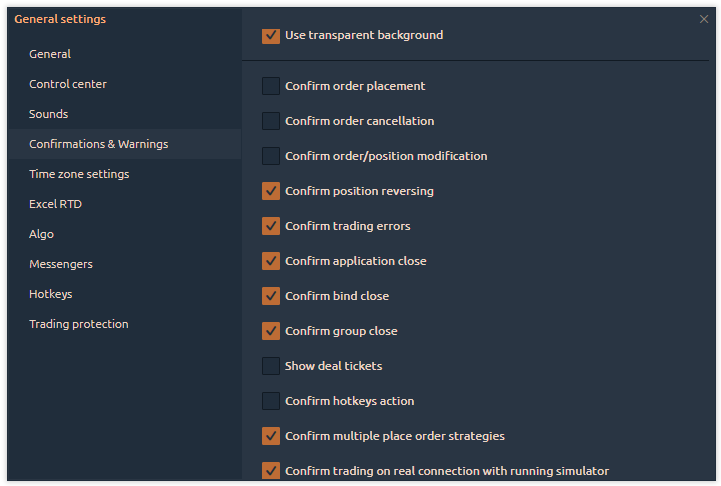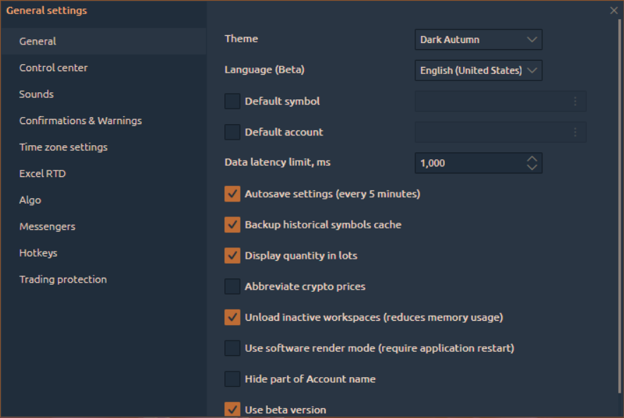 Default account — specify the trading account that should be set as the default option in all trading panels.