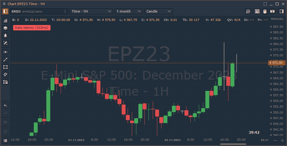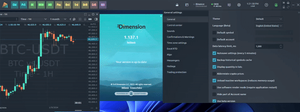 Data latency limit, ms — set a threshold value, and when it's reached, a message about market data delays will be displayed in the trading panels. For example, if you set a 100 ms limit, you will see the message on the chart.