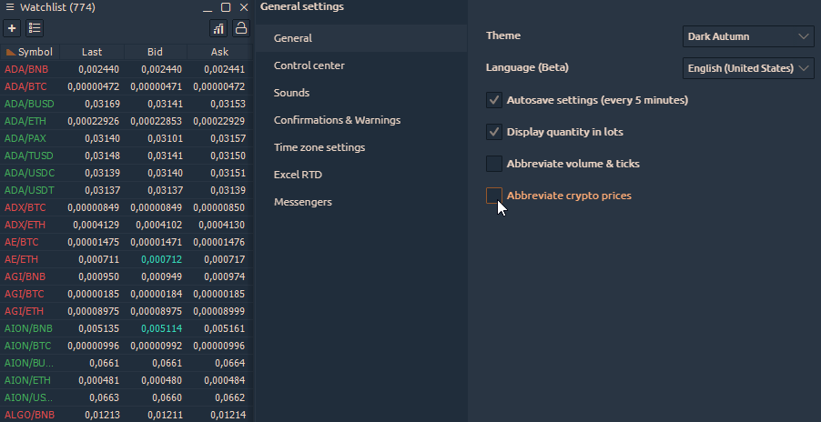 Abbreviate crypto prices — this option displays the abbreviated values of cryptocurrency prices that have a large number of zeros.
