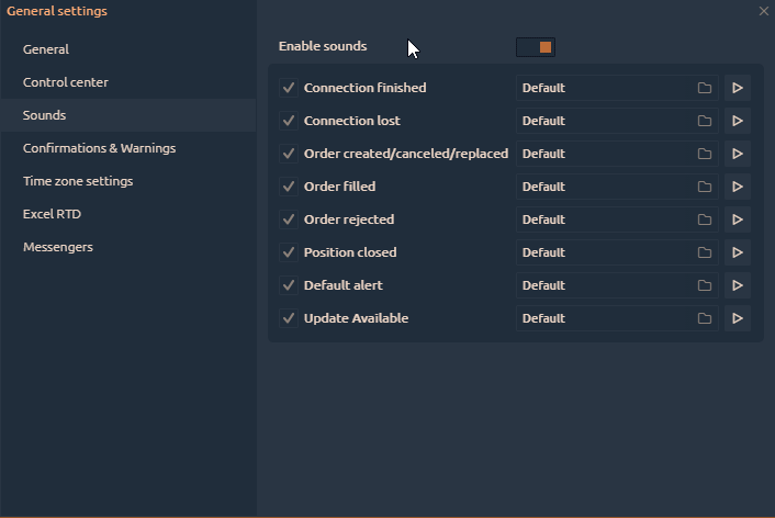 Enable sounds — activates or disables all of the application sounds globally