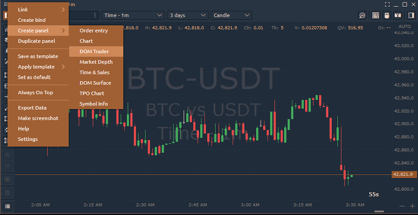 Create Panel. Open a new panel with the current symbol. You can open the following panels: Order Entry, Chart, DOM Trader, Market Depth, Time&Sales, DOM Surface, TPO Chart, Symbol Info