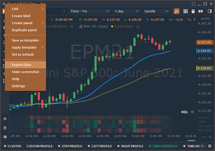 Export Data. Export data from a chart or table to an external CSV file. This includes price data, indicator values, and table values. Also, you can use the HISTORY EXPORTER panel.