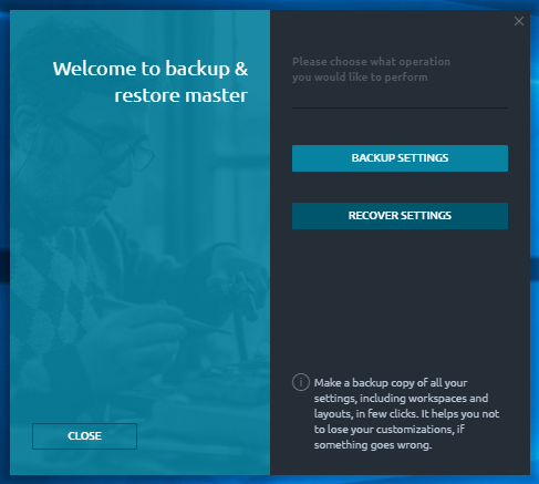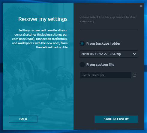 Backup & restore manager plugin allows to keep your settings safe and restore them in case of troubles with the application. This smart tool can backup your global settings, connections credentials, workspaces and per panel layout settings in one local file, that can be used later to restore them in several clicks.