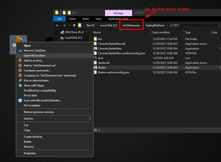 Sometimes all platform's settings need to be reset to default. To do this, close the platform, Right-click on 3rd Dimension icon and select Open File Location from the context menu.