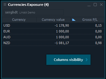 Currencies Exposure panel shows a summary currency information for all positions, opened on Forex instruments. Currencies Exposure panel is related to Informational group of Control Center sidebar.