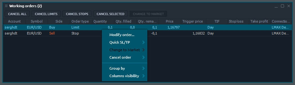 By right-clicking on each row of Working orders panel, you will get a context menu with the following functions: