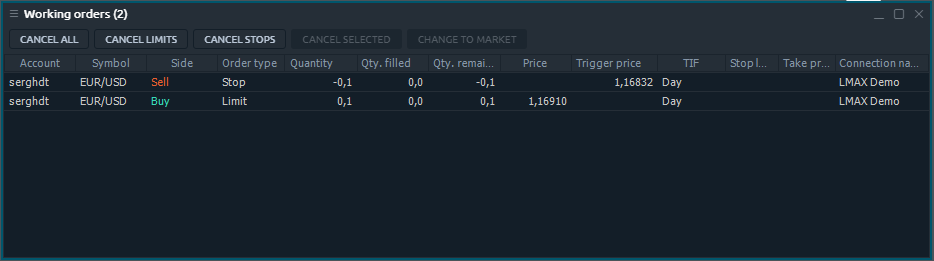 Working orders panel displays all currently placed orders. Once you places a new order, it appears in this panel and becomes available to be managed. Working orders panel is related to Portfolio group of Control Center sidebar.