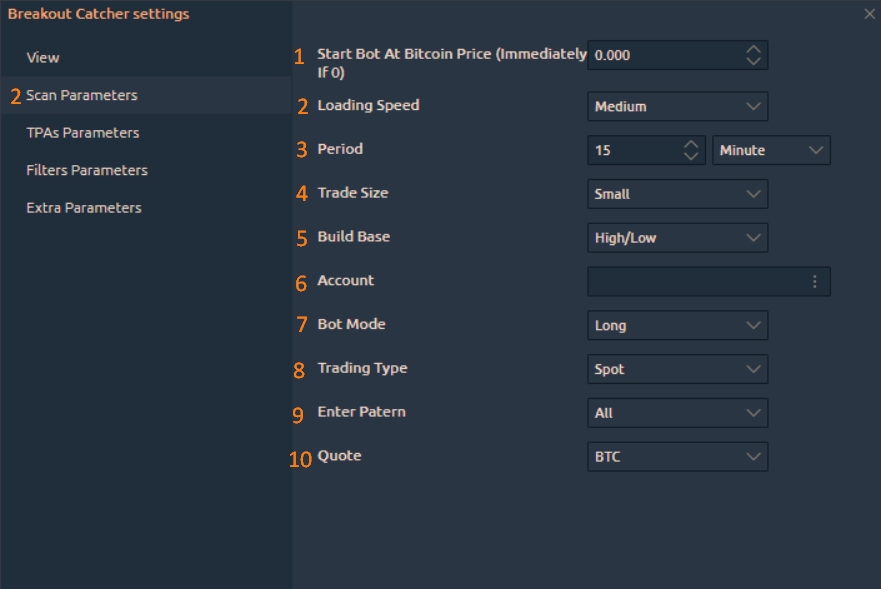 This field provides users with the flexibility to choose when the bot should start scanning the market. If a specific Bitcoin price is set, the bot will initiate its scanning strategy only when the market reaches the specified price. Leaving it empty or setting it to 0 triggers an immediate start.
