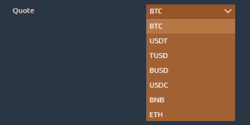 Users can select their preferred quote currency from a drop-down menu (BTC, USDT, TUSD, BUSD, BNB, ETH) for trading pairs.